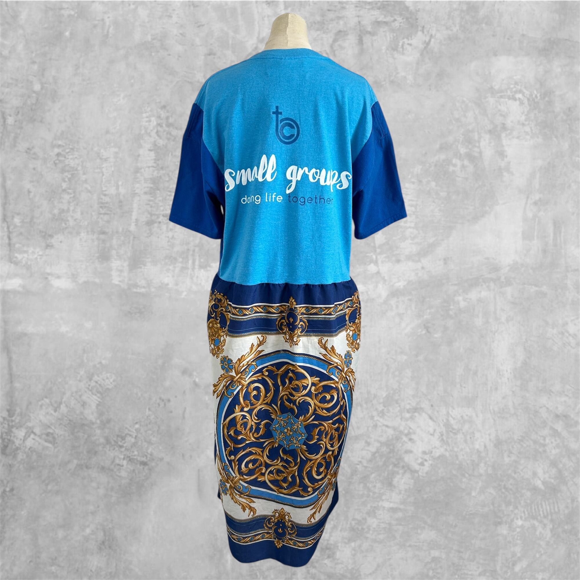 ユーズド ブルー系プリントTシャツにヴィンテージスカーフを組合せリメイクしました。