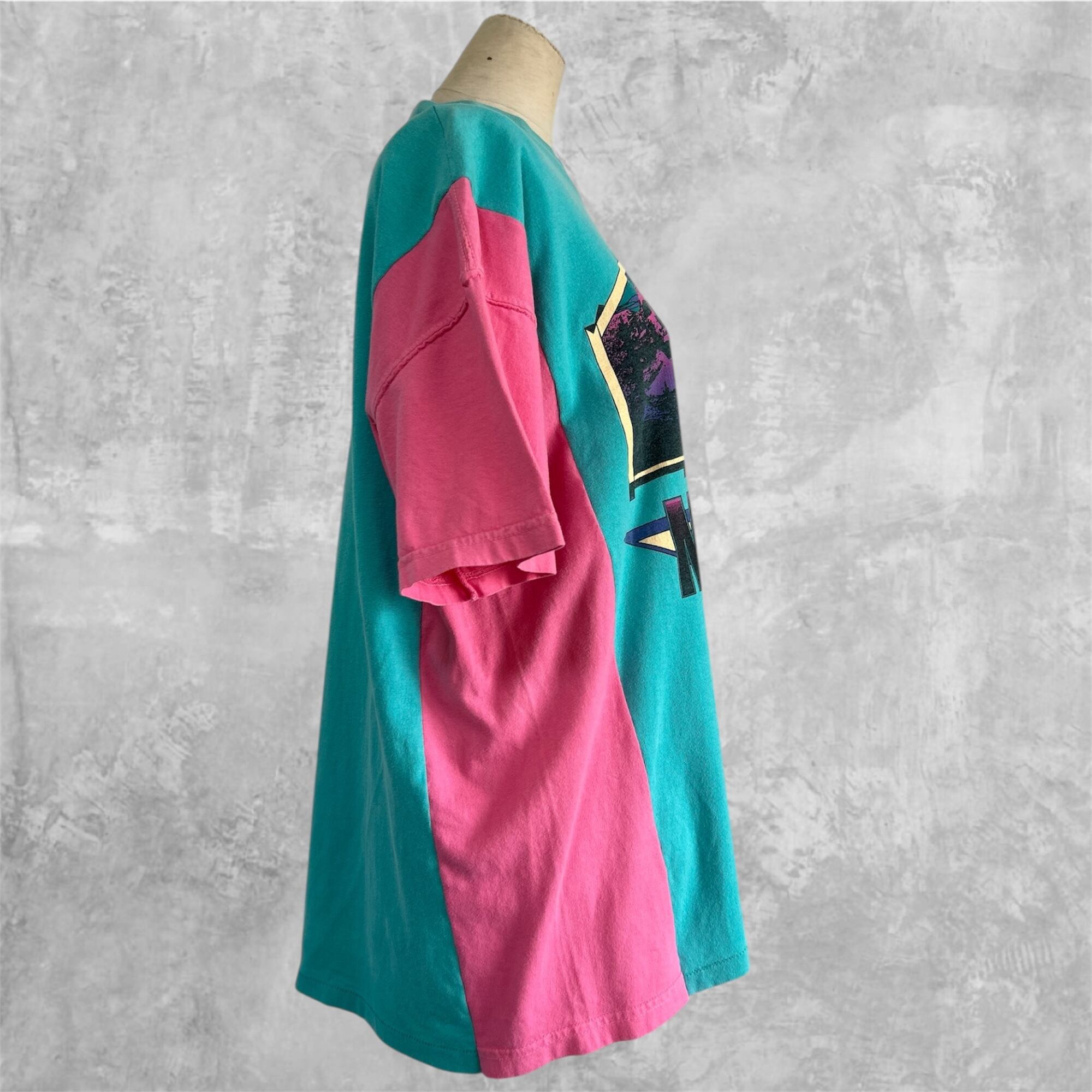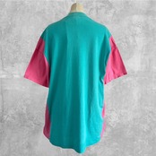 ターコイズブルーのTシャツにショッキングピンク