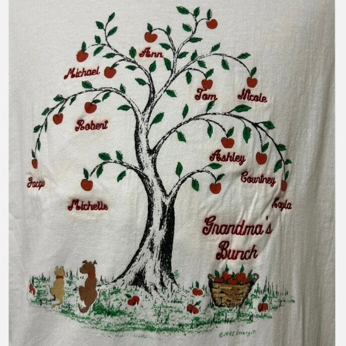 リンゴの木プリントに刺繍でネームされている