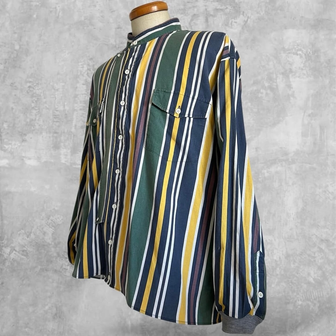スモーキーカラーなネイビー。グリーン。イエロー。パープル。ホワイトのストライプ柄シャツ!